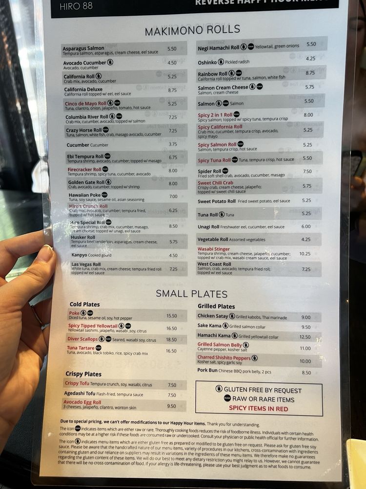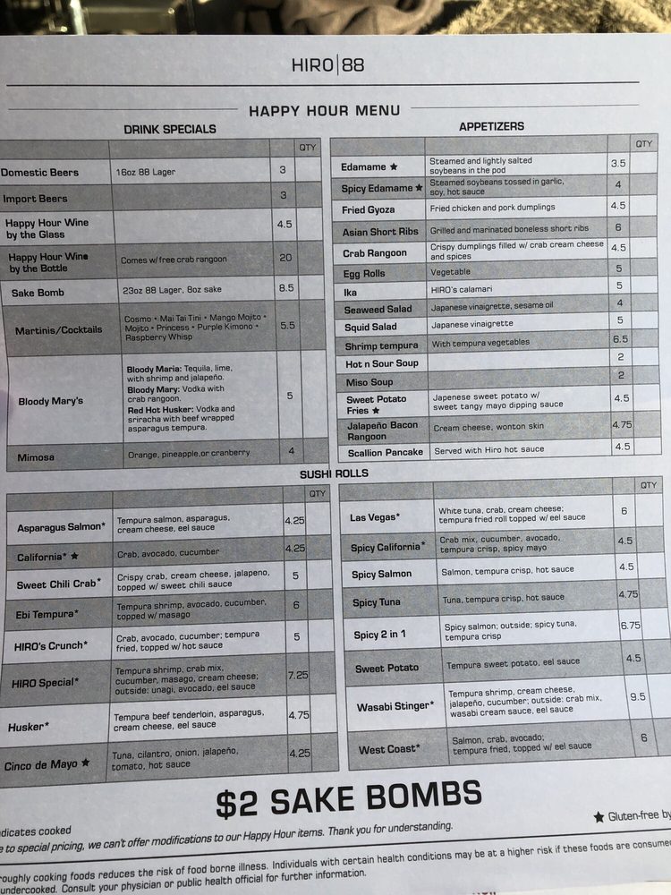 Hiro 88 in Omaha, NE offers a trendy and classy dining experience with a menu featuring a variety of sushi rolls, hot plates, and happy hour specials. The restaurant takes reservations, offers delivery and takeout, and has vegan and vegetarian options available. Not suitable for children, Hiro 88 is perfect for groups looking for a lively atmosphere. The 88's Favorite Makimono Rolls include unique options like the Black Pearl Roll and Cinco de Mayo Roll, while classic rolls like Caterpillar and Ebi Tempura are also available. Hot plates like Charred Shishito Peppers and Gyoza are popular choices. Customers praise the fresh sushi and friendly service, with many highlighting the great happy hour deals. Hiro 88's all-day happy hour on Sundays is a favorite among patrons.